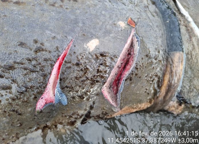 Ao ser encontrado, “Astro” apresentava múltiplos cortes profundos nas regiões lateral e dorsal do corpo, provocados por hélices de embarcação. Alguns ferimentos ultrapassam 4 centímetros de profundidade, causando dor intensa e exigindo acompanhamento veterinário imediato.