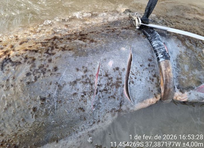 “Trata-se de um ferimento extenso provocado pelas hélices, com áreas profundas, processo inflamatório e risco de infecção. O animal apresenta dor e bastante desconforto. A navegação intensa e em áreas rasas aumenta significativamente o risco de novos atropelamentos”, afirmou.