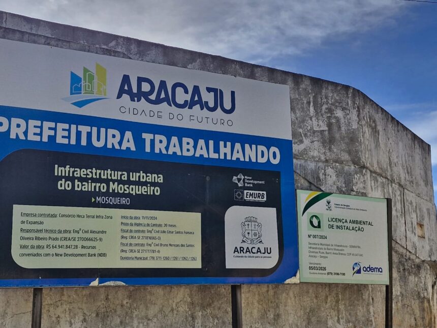 A placa instalada no Porto da Zenza, no bairro Mosqueiro, povoado Areia Branca, informa que a Prefeitura de Aracaju executa uma obra de infraestrutura urbana iniciada em 28 de novembro de 2024, com prazo contratual de 20 meses e valor de R$ 64.941.847,28, financiada com recursos do New Development Bank (NDB), o banco dos BRICS. A execução está a cargo do Consórcio Heca Terral Infra Zona de Expansão, sob fiscalização da Empresa Municipal de Obras e Urbanização (Emurb).
