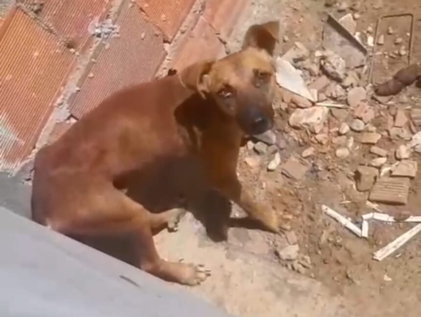 O animal apresentava um estado de extrema magreza, tinha dificuldade para se mover e encontrava-se em um ambiente insalubre e desabitado, cheio de pedras e restos de construção. Não tinha proteção contra a chuva ou o sol, nem água ou comida.