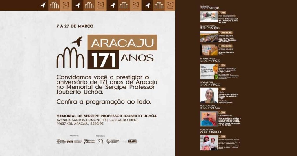 O Memorial de Sergipe Prof. Jouberto Uchôa realizará uma programação cultural e educativa em alusão aos 171 anos de Aracaju, comemorados em 17 de março. As atividades ocorrerão entre os dias 7 e 27 de março, com entrada gratuita.