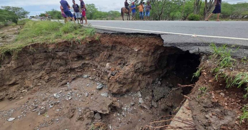 Um trecho da Rodovia SE-290 permanece totalmente interditado entre os municípios de Poço Verde e Tobias Barreto, no centro-sul de Sergipe, após erosão provocada pelas fortes chuvas que atingem o estado.