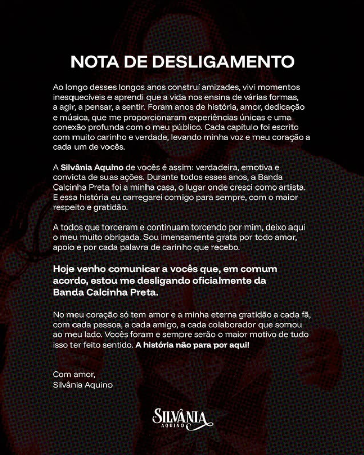 “Durante todos esses anos, a Banda Calcinha Preta foi a minha casa, o lugar onde cresci como artista. Essa história eu carregarei comigo para sempre, com o maior respeito e gratidão.”