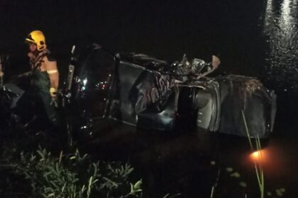 Carro bateu em um poste, tombou e caiu em um lago após saída de pista…